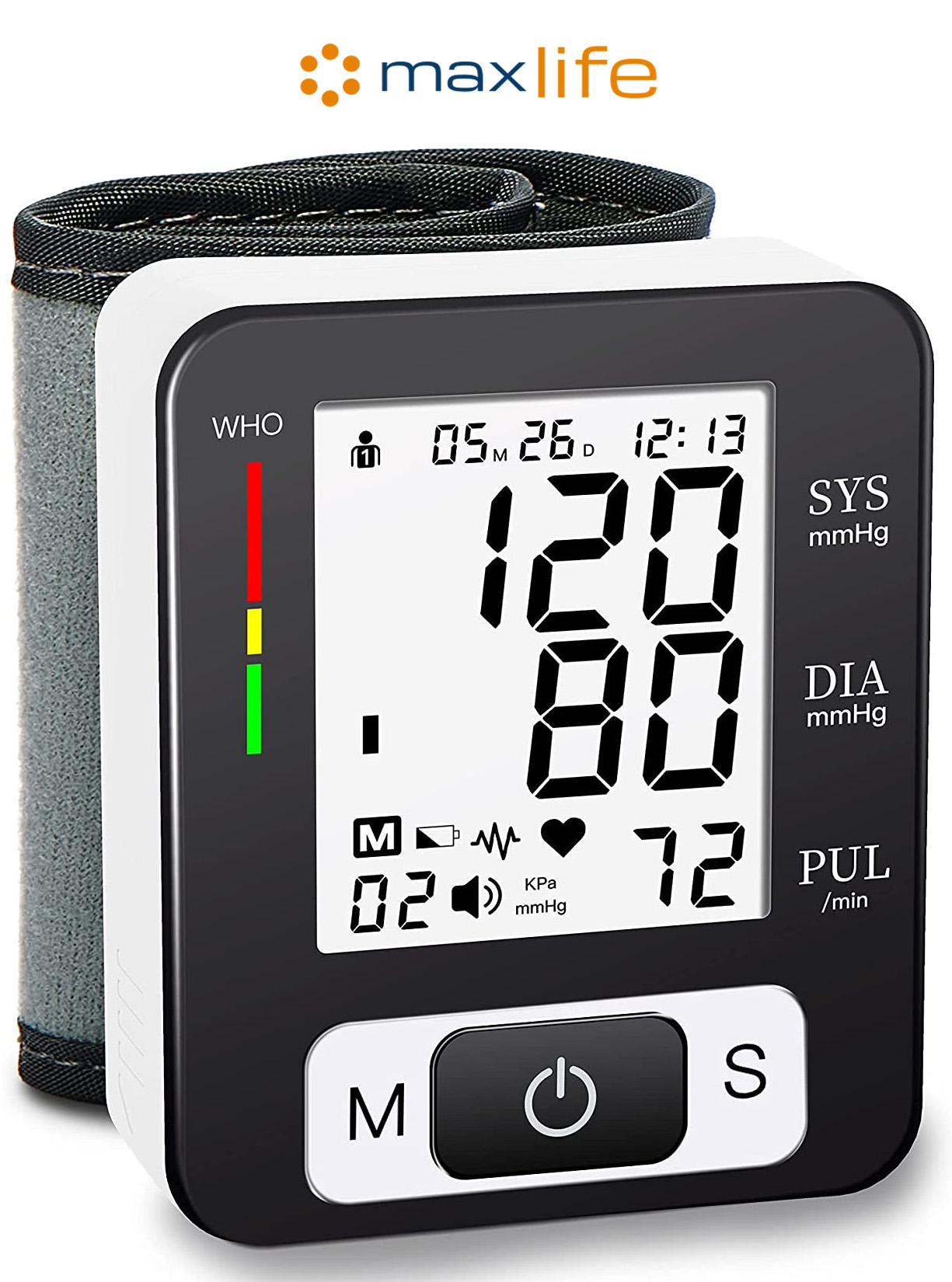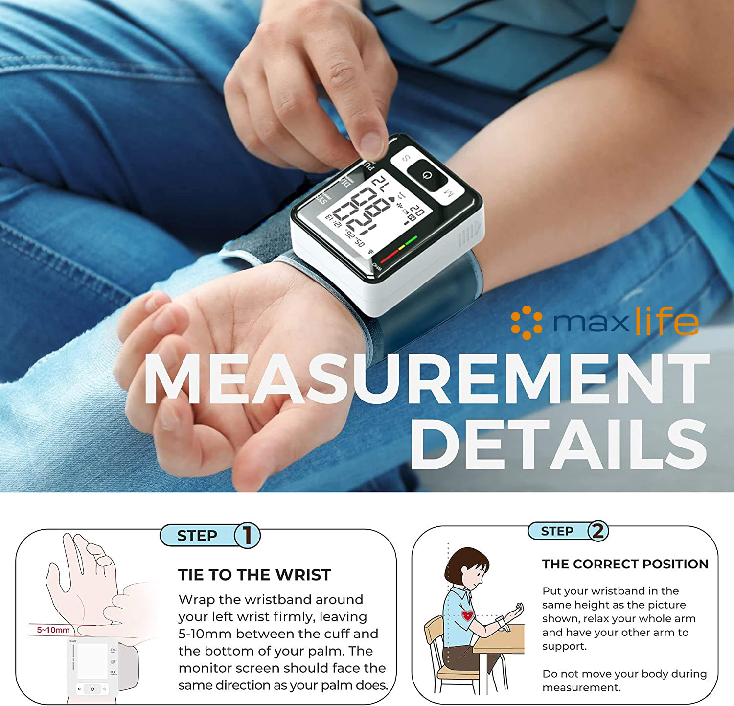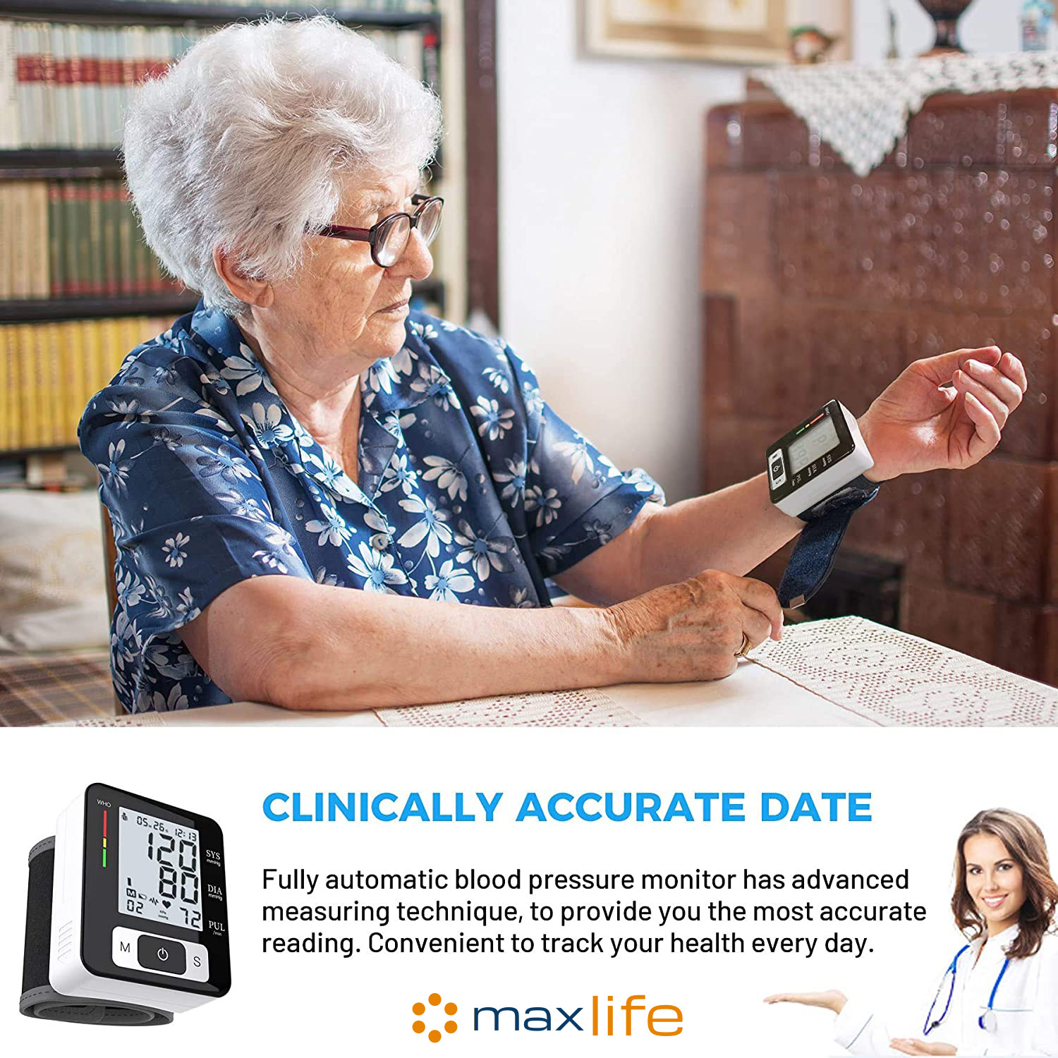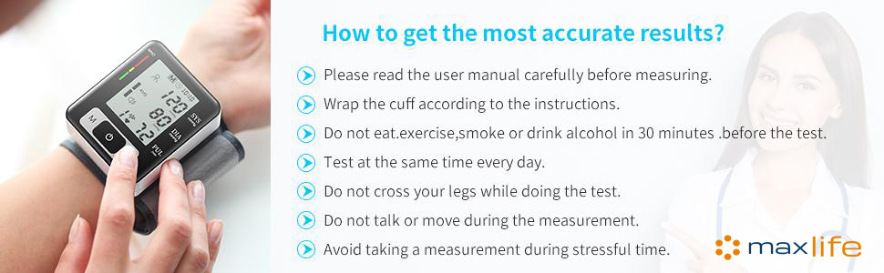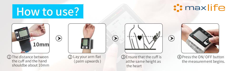 - Wrist-type Digital Blood Pressure Monitor: An automatic arm cuff LCD blood pressure pulse monitor with portable design, measuring user’s heartbeat with an effective warning of heart disease, and monitoring your blood pressure at home or outside