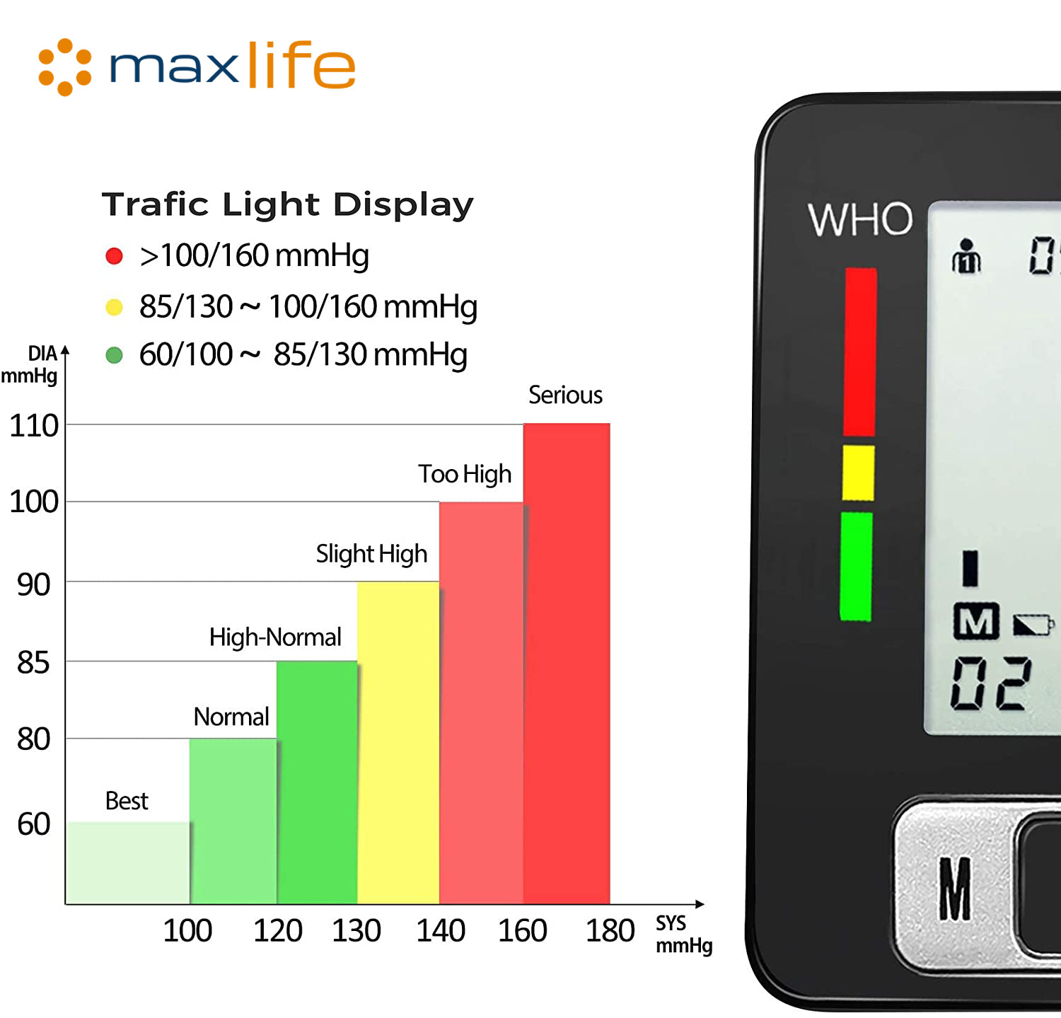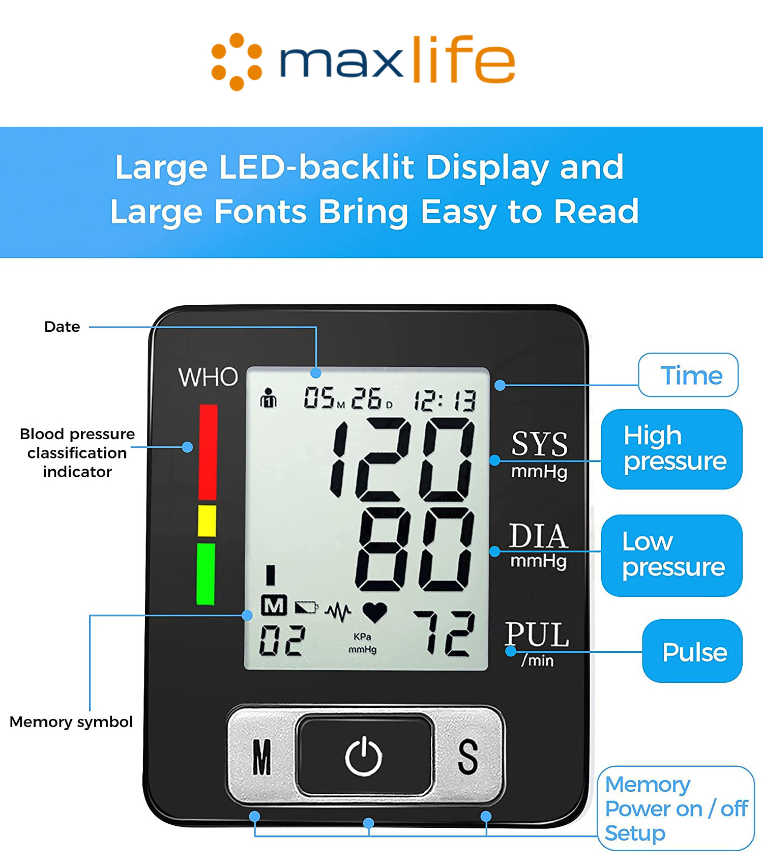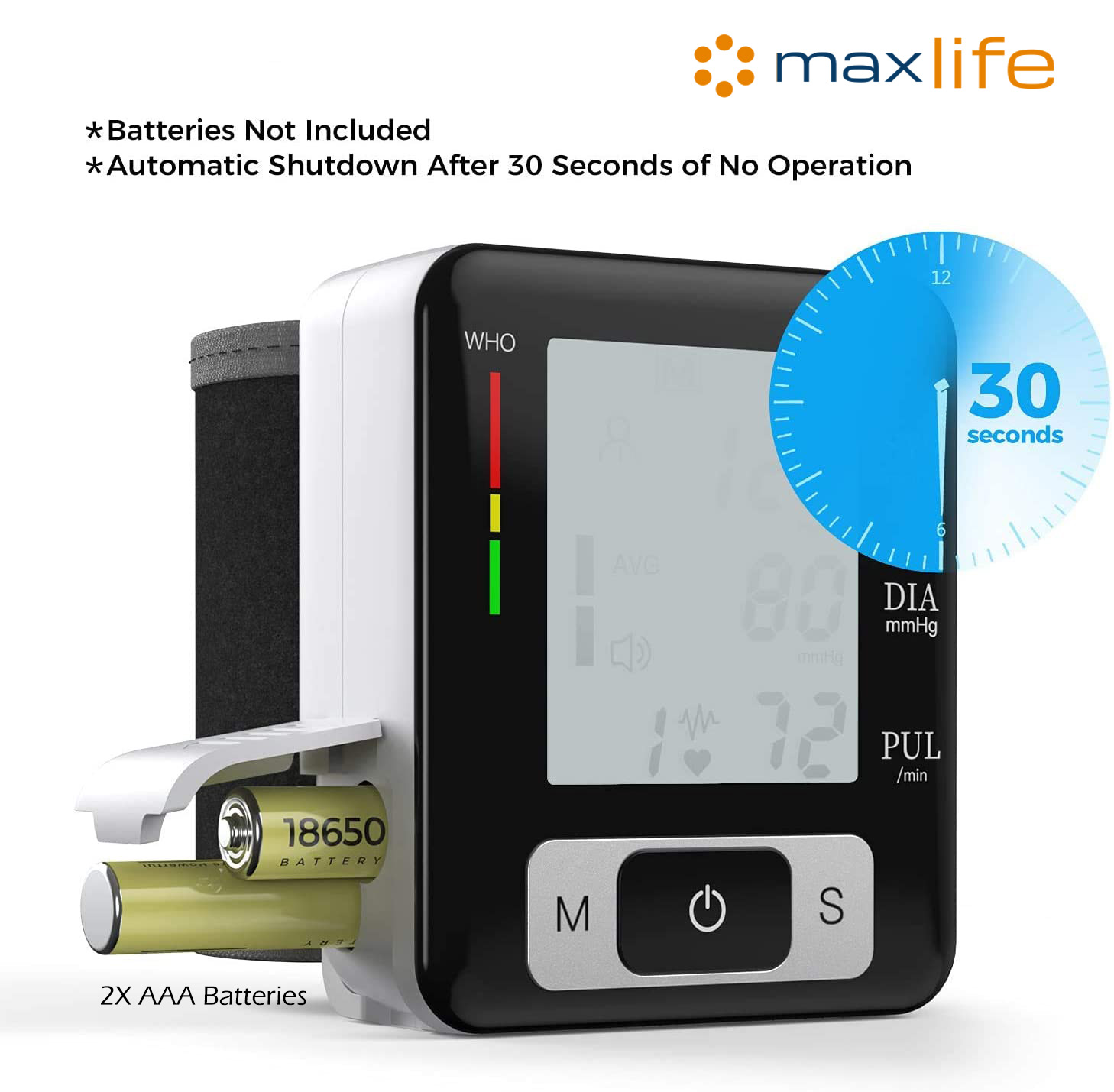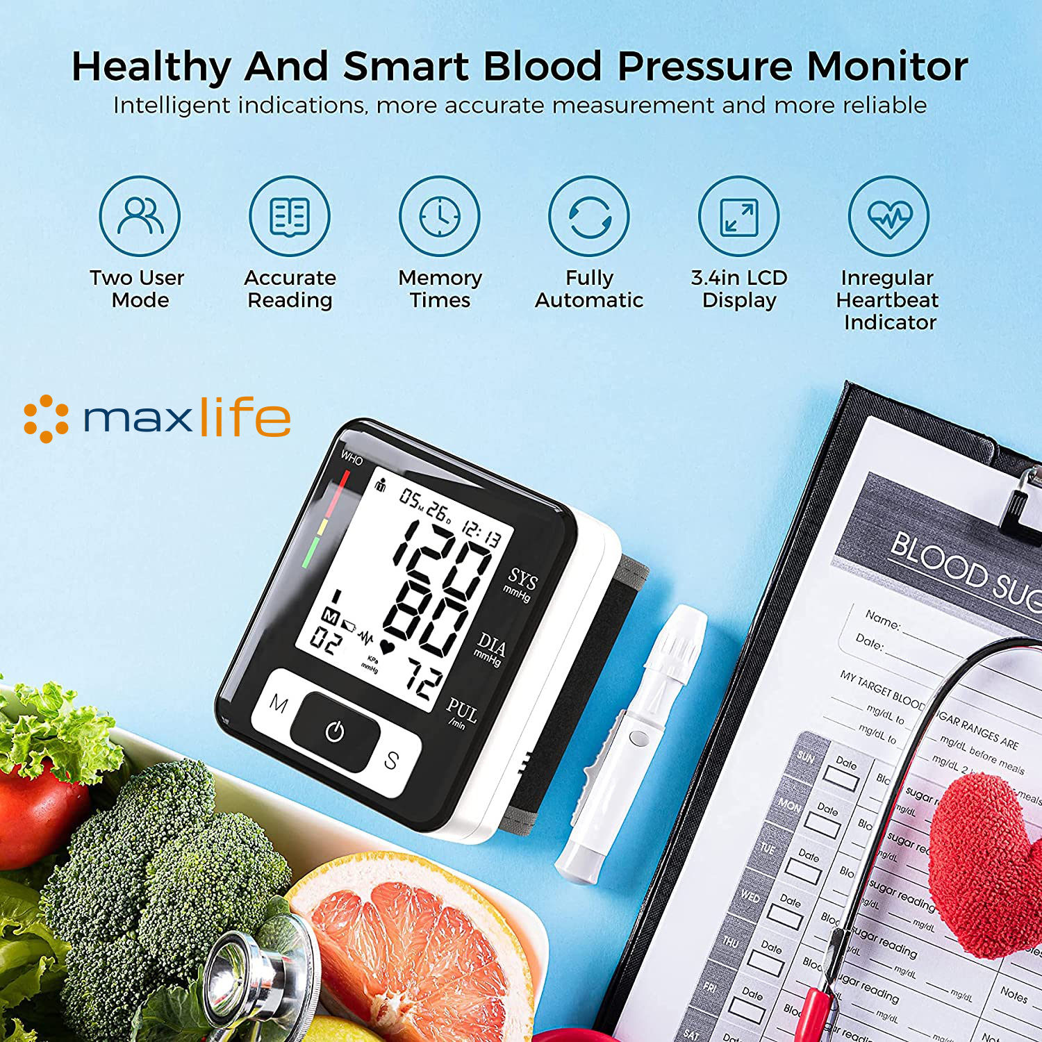 - Wrist-type Digital Blood Pressure Monitor: An automatic arm cuff LCD blood pressure pulse monitor with portable design, measuring user’s heartbeat with an effective warning of heart disease, and monitoring your blood pressure at home or outside