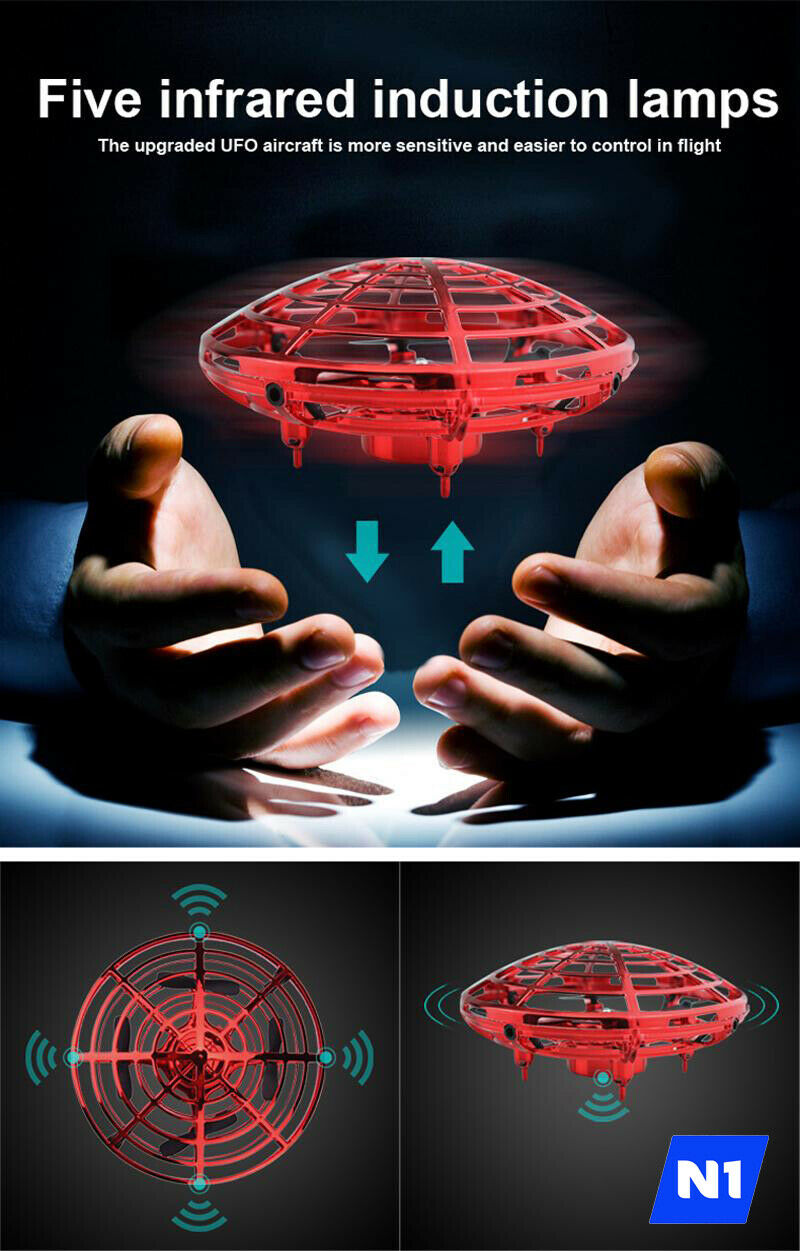 Upgraded Sensory Ability — 5 infrared sensors equipped. Smartly test the height and distance to automatically land off or escape. Upgraded from the normal flying UFO of other brand, to ensure the safety and fun, let the flying toy controlled in your palm rather than in chaos anymore!